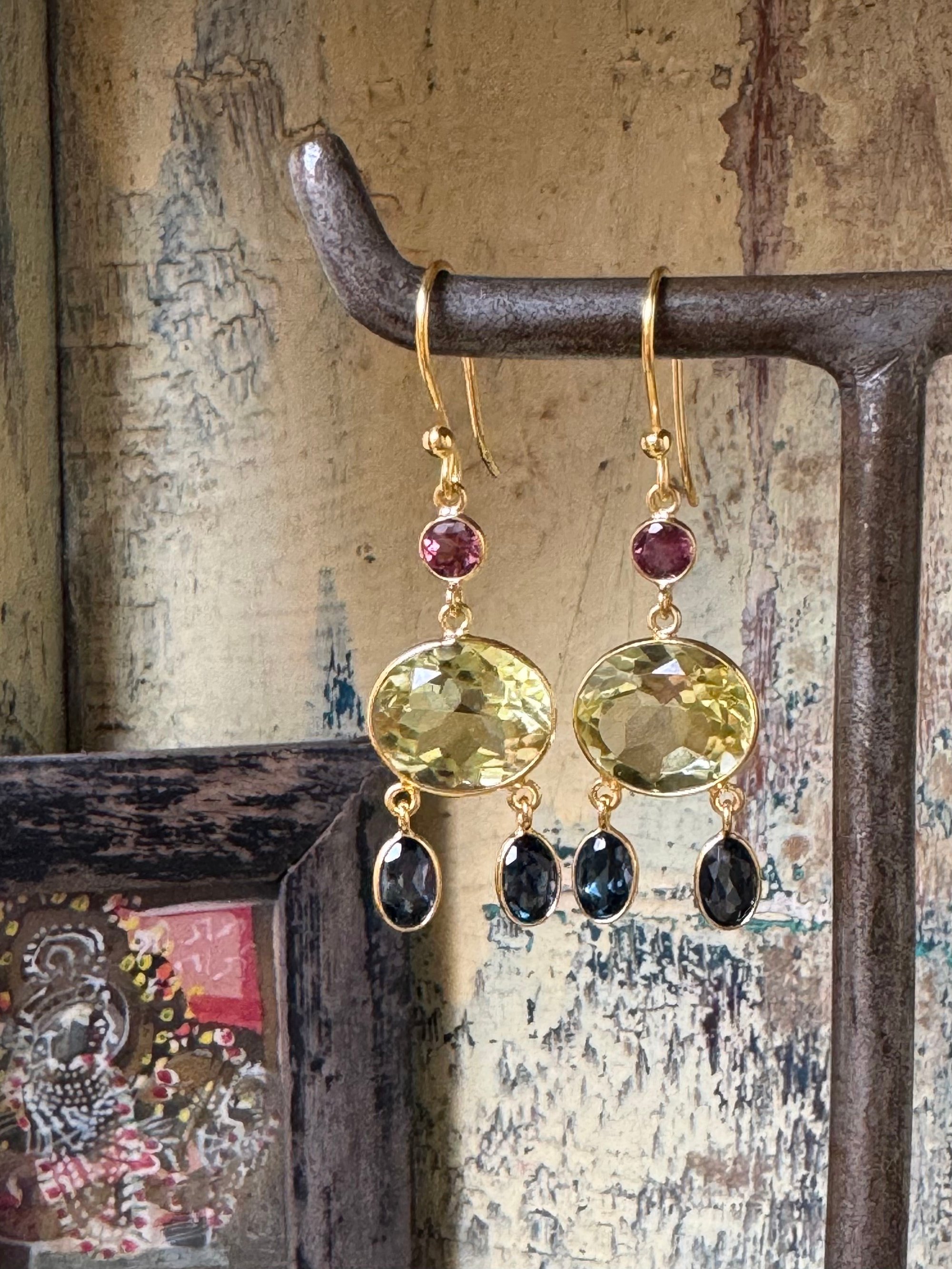Boucles d'oreilles en or 18 carats, tourmaline rose, quartz jaune citron et topaze bleue, réalisées à Jaipur