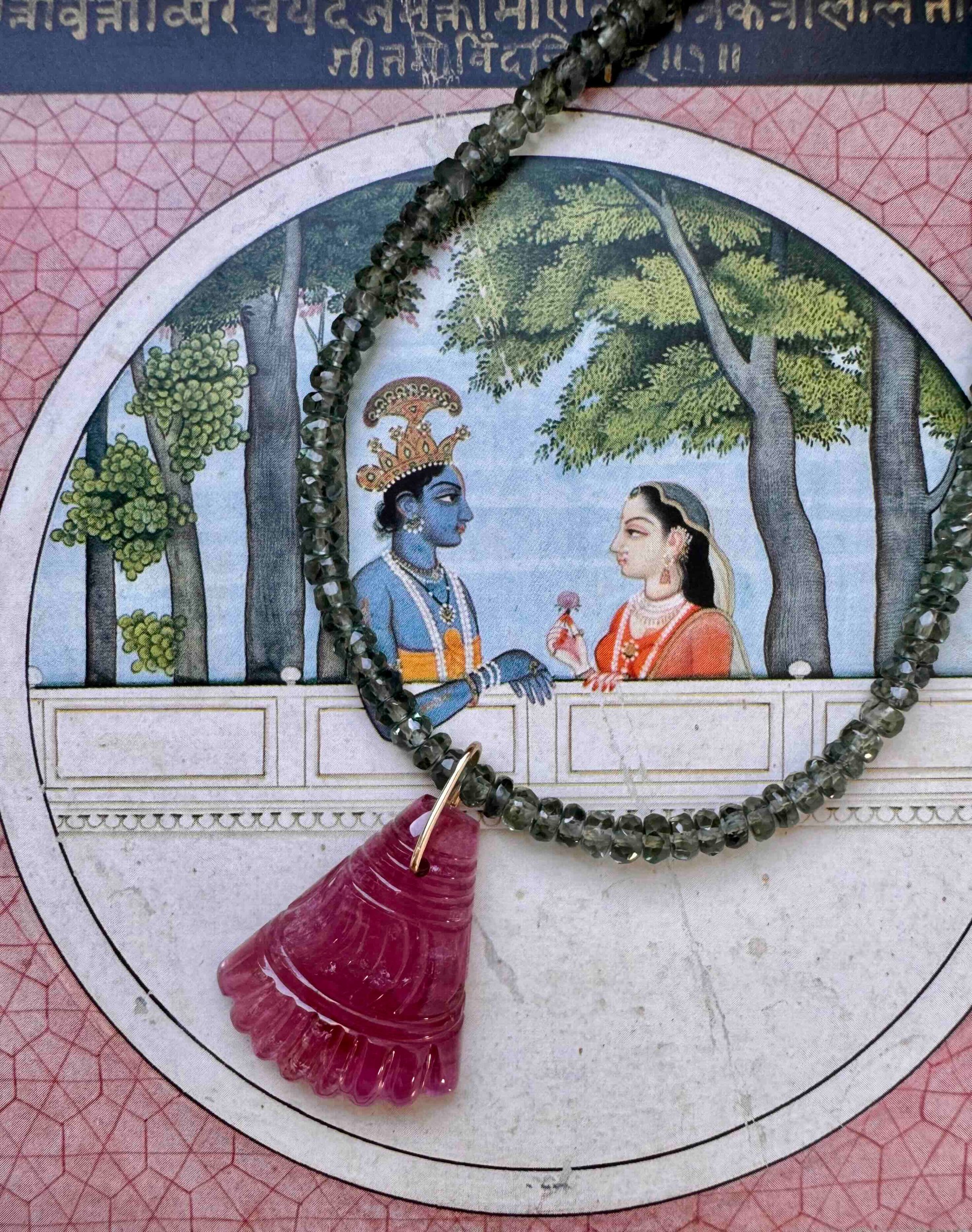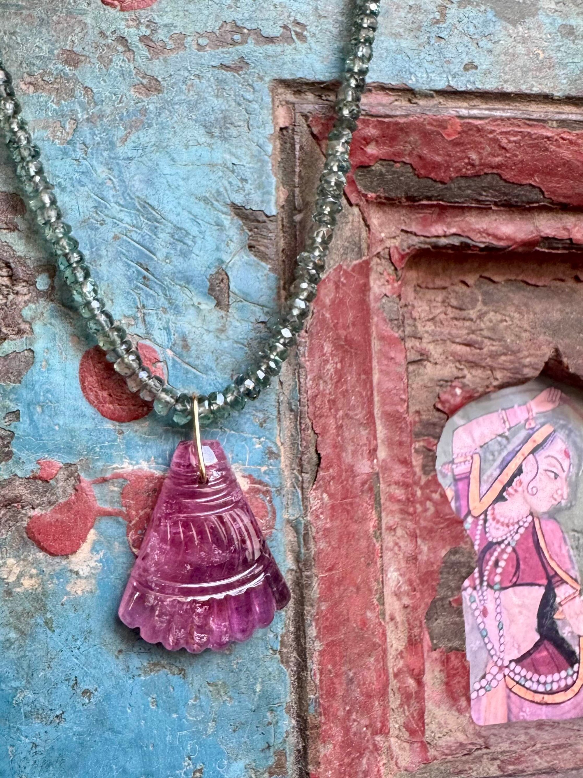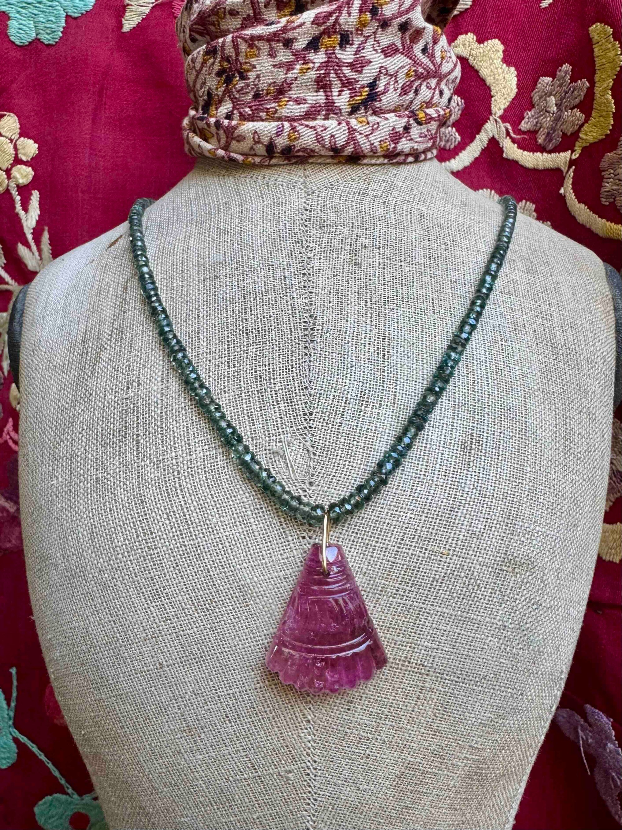 Collier en perles de saphir facettées, orné d'un pendentif en tourmaline rose gravée forme palmette avec bélière en or 18 carats, fermoir or 18 carats
