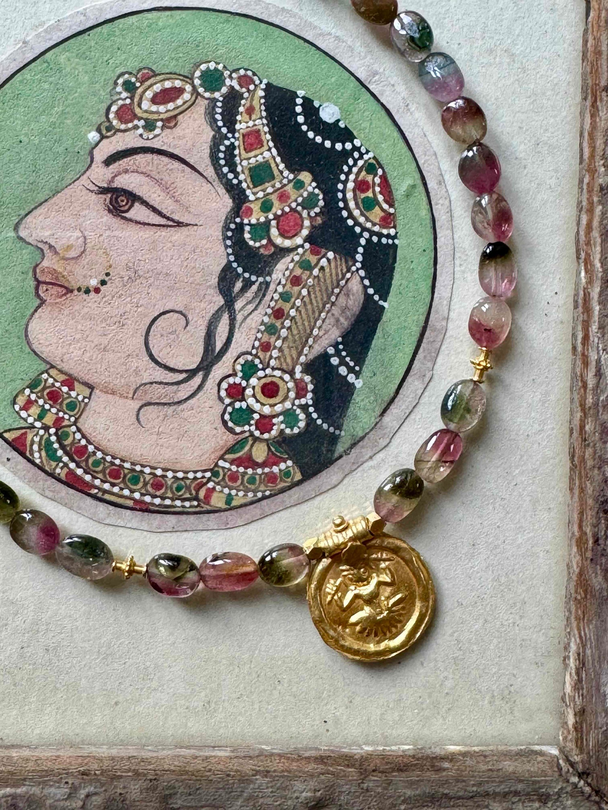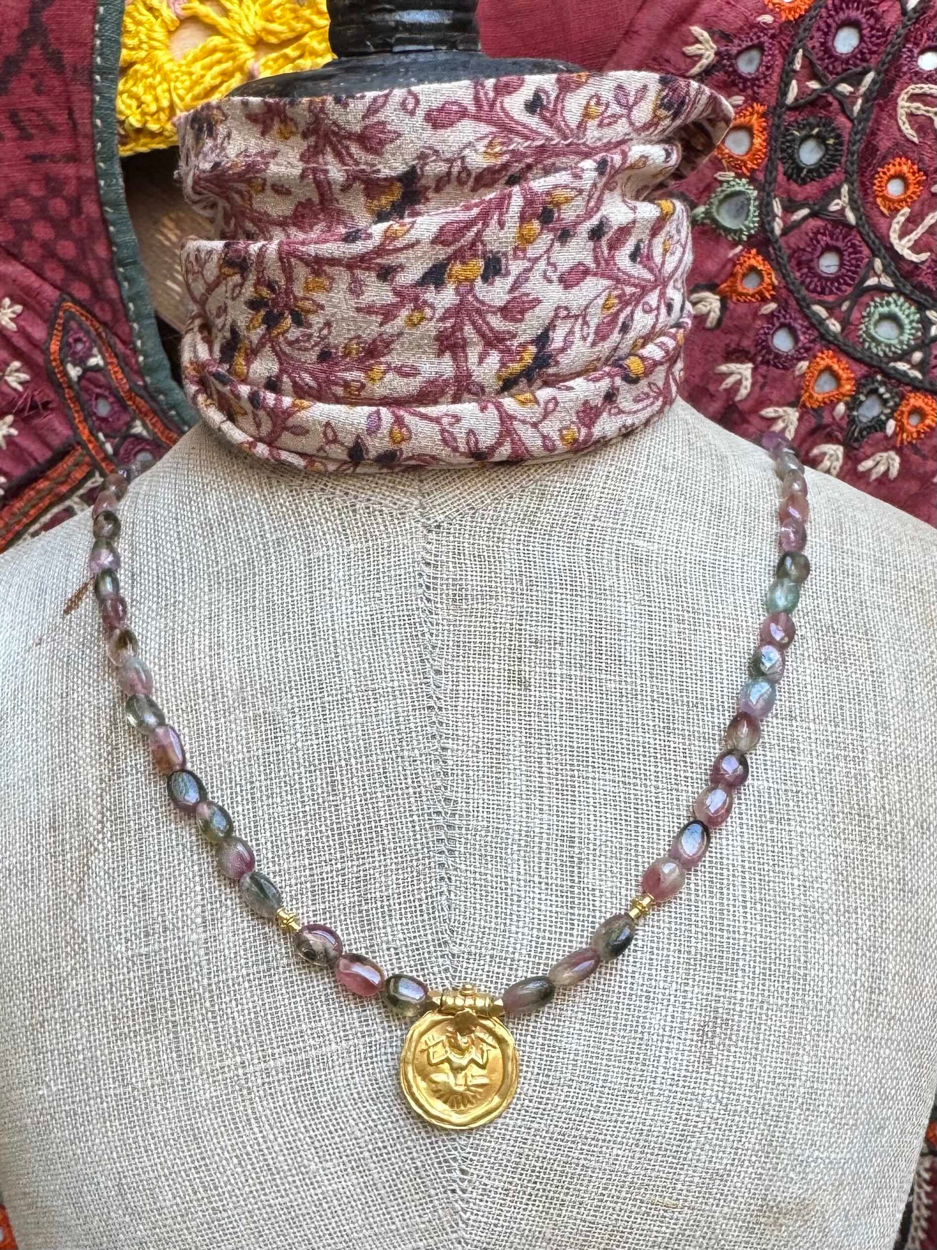 Collier en perles de tourmaline “watermelon“ ovale lisse, orné d'un ancien pendentif Inde du Sud, deux perles motif granulation en or 18 carats, fermoir en or 14 carats