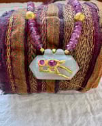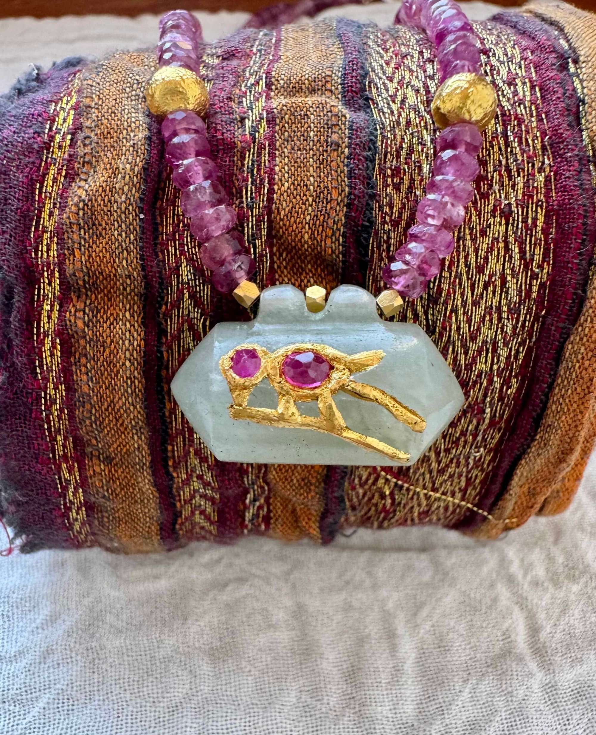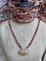 Collier en perles de tourmaline facettées, pendentif indien vintage en jade avec motif oiseau, deux perles texturées en or 18 carats, perles intercalaires en or 18 carats, fermoir en gold filled avec chaînette d'extension